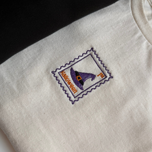 Celebrate Halloween in style with our Embroidered Witch Hat Halloween T-Shirt! Featuring a bold purple witch hat with a golden buckle, this design is carefully stitched in detail for a premium, long-lasting look. Unlike printed shirts, this embroidered piece adds texture and depth, making it a unique standout in your Halloween wardrobe.